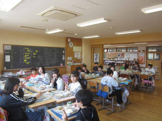 新学期最初の給食です。ほかほかごはんにスタミナ炒め。久しぶりの給食に笑顔いっぱいです!そして、さすが6年生!準備もさっとできていました。