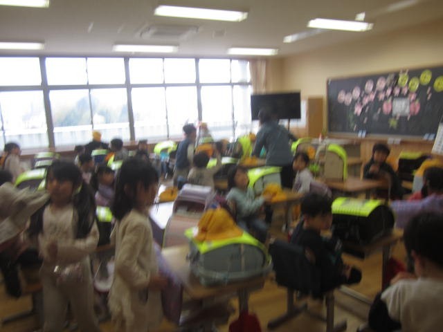 風の強い中、元気に登校した1年生。3時間目に行ったら、とっても静かに帰りの用意をしていました。