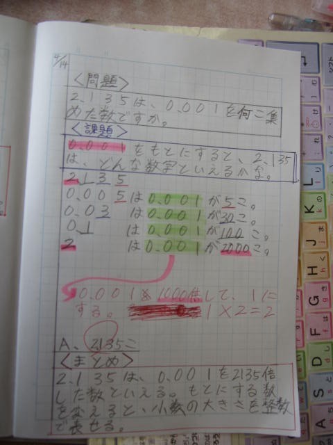 まとめとノートの工夫 公開日 2026/04/14 更新日 2026/04/14 5年生 小数のしくみのまとめをしていました。板書をうつすだけでなく、大切なところにはマーカーで線を引き、どういうことかがわかるノートづくりをしているお友達がいました。さすが高学年!