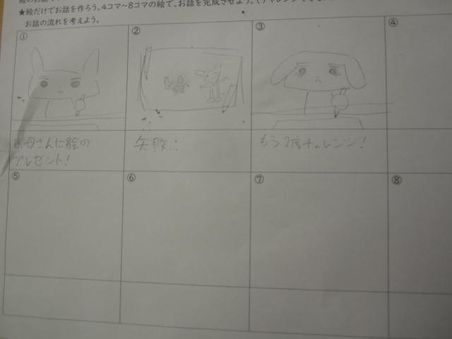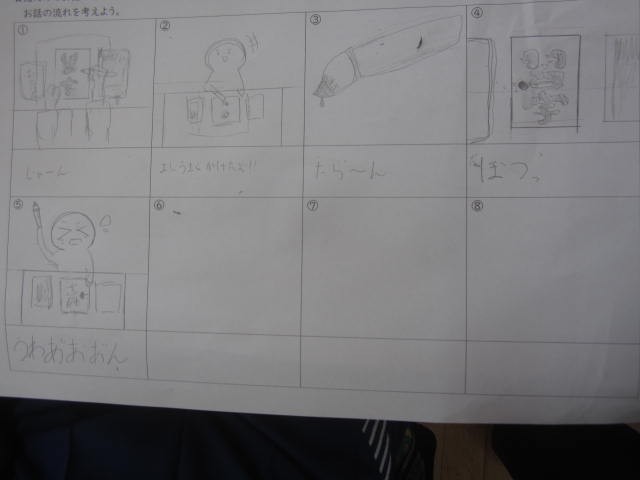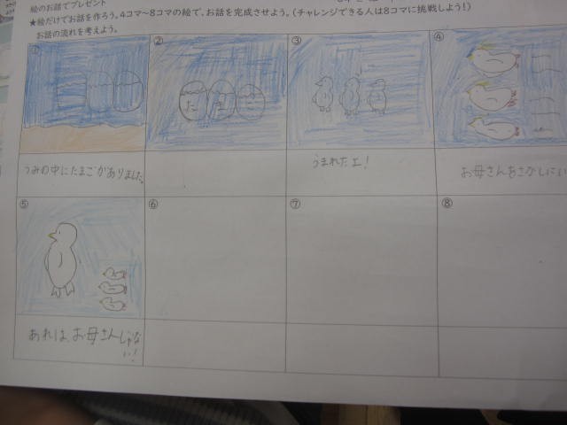 4コマか8コマでマンガを描いています。さすがは6年生!ストーリーも絵も上手です!!海の中でたまごからうまれたのは・・・習字が上手に書けたと思ったら・・・穴におっこちゃったのに・・・絵が失敗したけど・・・