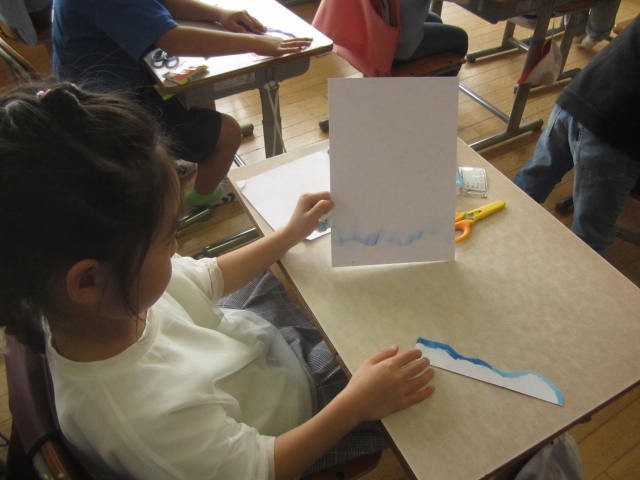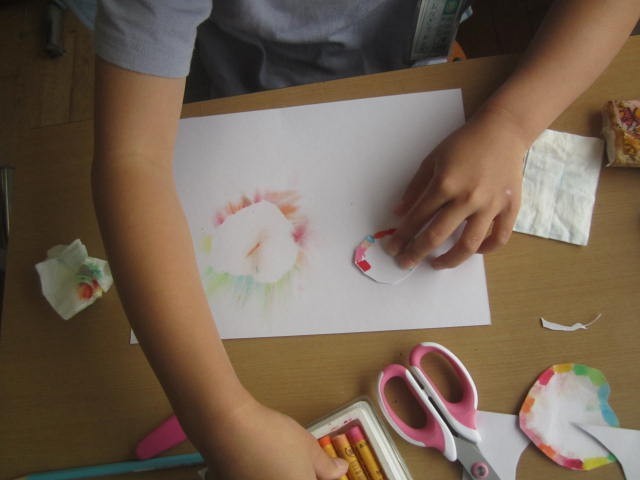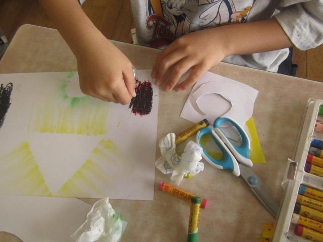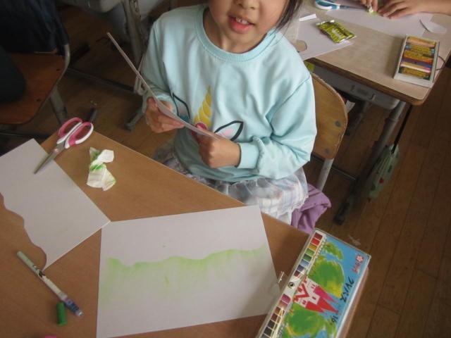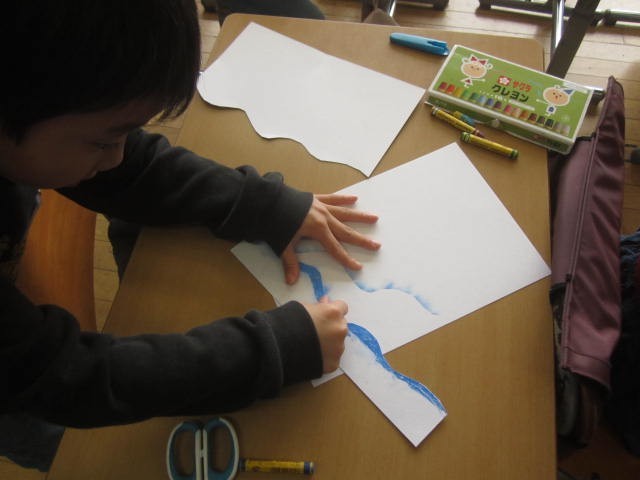 クレヨンを塗って、指やティッシュでこするとすてきなぼかしができます。ステキなクレヨン魔術師がいっぱいの2年生です。