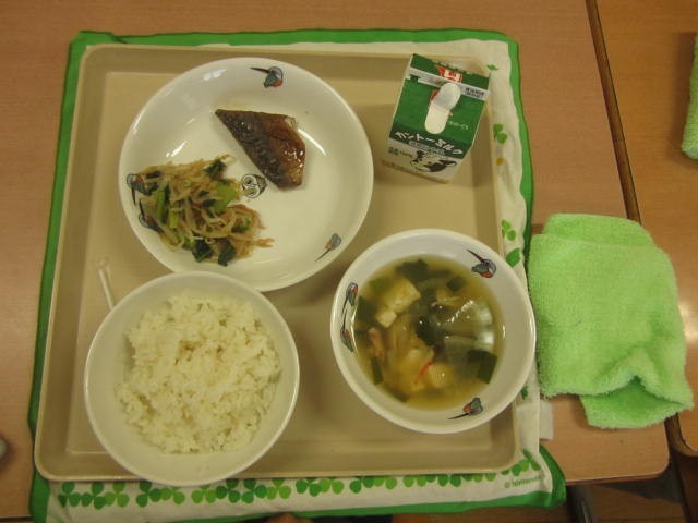 今日の給食は、鯖のみそ煮。おかか和え、かにかま汁です。2年生の給食当番は上手に盛...
