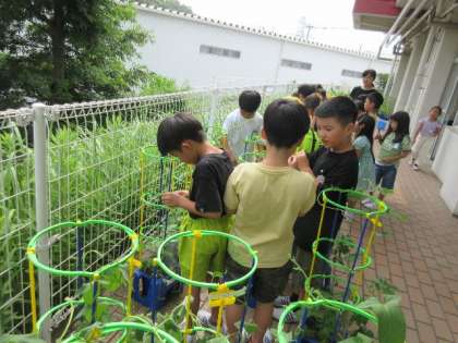 ベランダでお世話をしているアサガオのつるが伸びてきました。生活科の時間にはアサガオと背比べをしてみました。「すご〜い。僕の背より大きくなっている!」歓声があがっていました。けれど、アサガオの花を脇からもたくさん咲いてもらうためには、「芯止め」が必要です。つるの先をつまんで先を切るのです。このことにより、脇からつるが伸びて、つぼみをたくさんつけるようになるのです。「こんなに伸びたのにごめんね。」と声をかけながら、つるの先をつまんでいました。