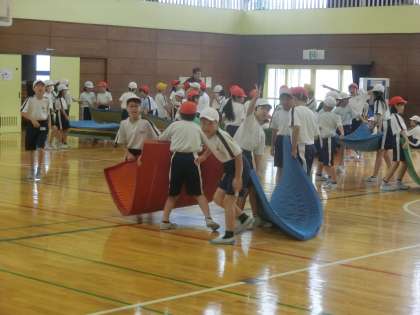 写真は、使用するマットを準備している様子です。自分達の力で、何でも出来るようになりました。