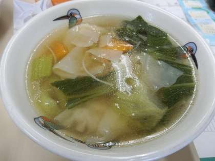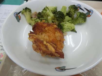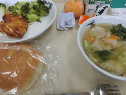 今日のメニューは、『鶏肉の唐揚げ』。『ブロッコリーのガーリックソティ』。『ワンタンスープ』。『こめパン』。『冷凍みかん』。