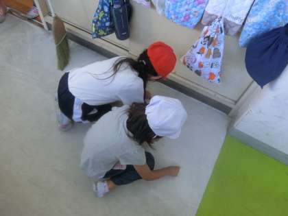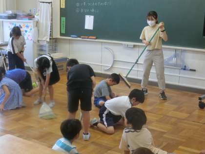 大掃除の様子です。子供たちは、一生懸命に校舎内をきれいにしています。頑張っていますよ。