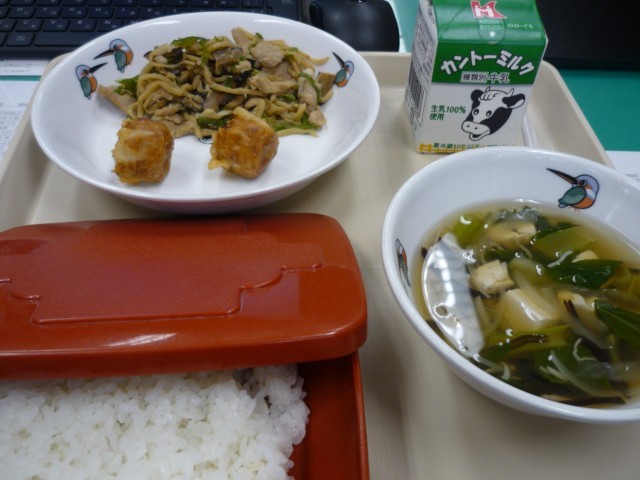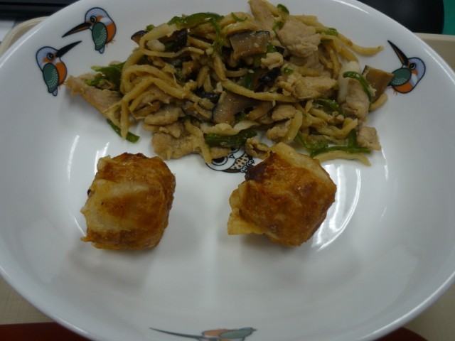 今日の献立は、『あげシューマイ』、『チンジャオロース』、『かにかま中華スープ』。
