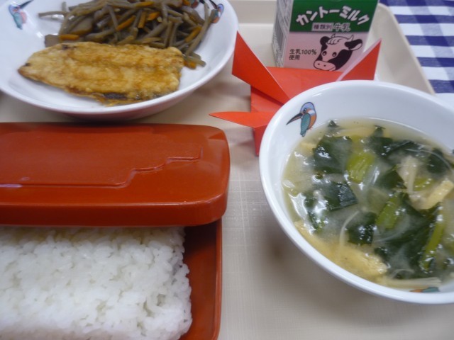 今日の給食です。今日の献立は『さんまの蒲焼き』、『五目きんぴら』、『みそ汁』。