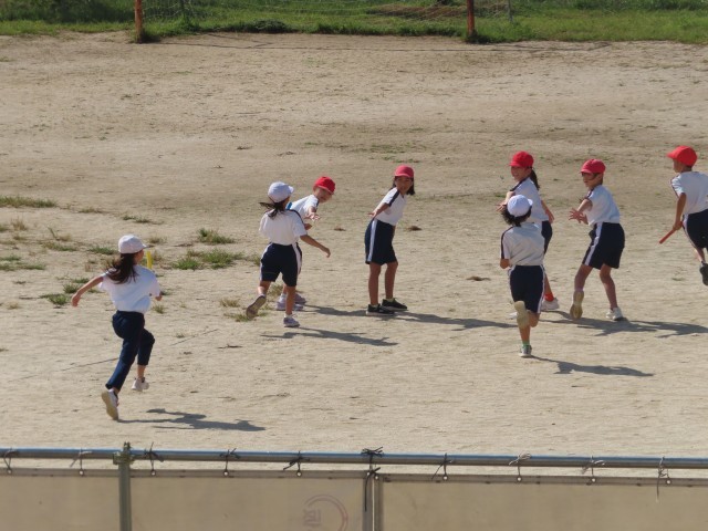 3年生の体育の授業の様子です。今日は『バトンパス』の練習をしています。