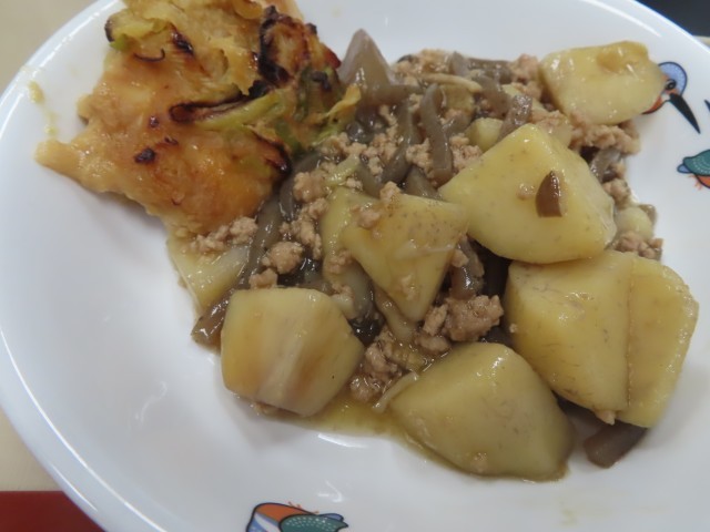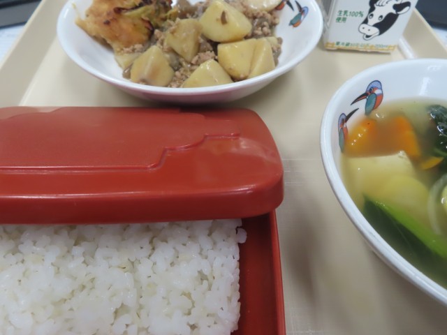 今日の給食です。今日は『麦ごはん』、『鶏肉のみそ焼き』、『里芋のそぼろ煮』、『お月見汁』。