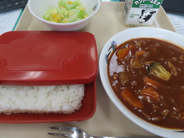 今日の給食です。今日は『ごはん』、『ハッシュドポーク』、『チーズサラダ』。