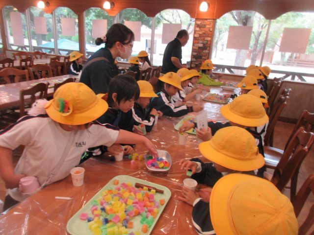 「こもれびもりのイバライド」に到着したら、最初にキャンドル作りに挑戦です。色のバランスを考えながらキャンドルキューブを紙コップに入れていきました。出来上がりをとても楽しみにしているようです。