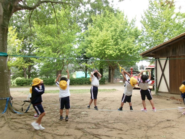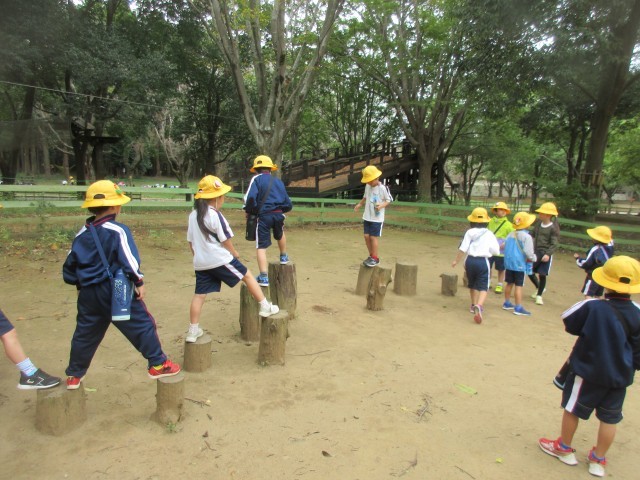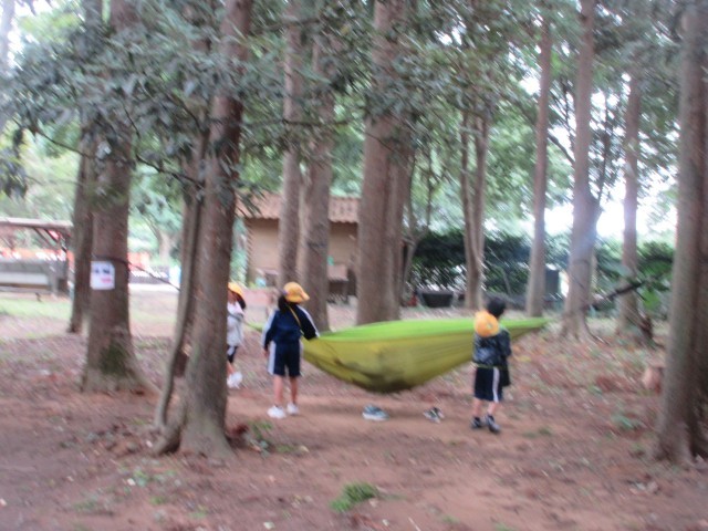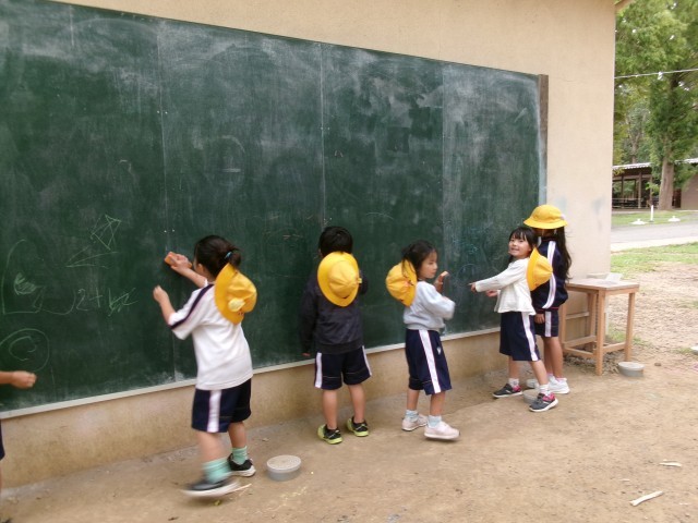 森で遊ぶ時間には、大きな黒板に絵を描いたり、スラックラインに挑戦したりしました。大きなドングリを見つけて集める人やコオロギを見つけている人もいました。それぞれに、自然の中で楽しい時間を過ごしていました。