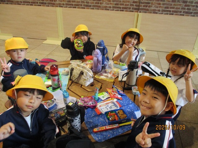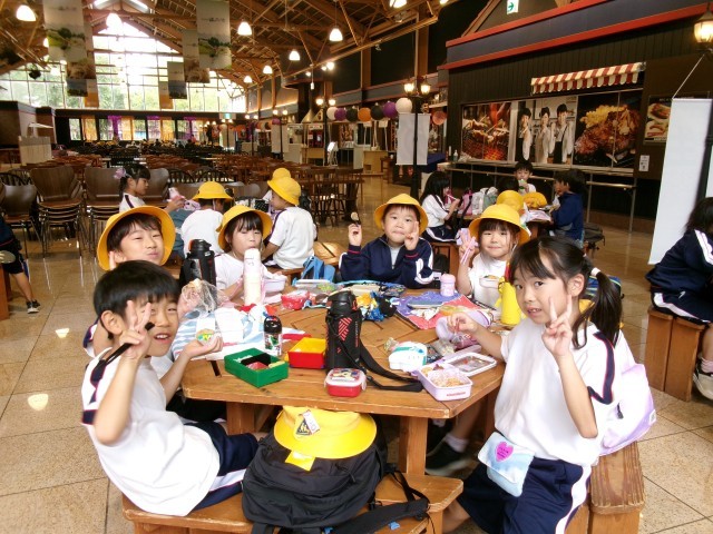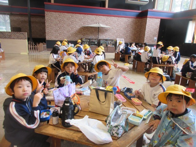 お昼ご飯は、マルシェホールに入ってグループでいただきました。「僕の大好きなウインナーが入ってる!やったー!」…笑顔いっぱいでお弁当を食べていました。朝早くから、お弁当の用意、ありがとうございました。