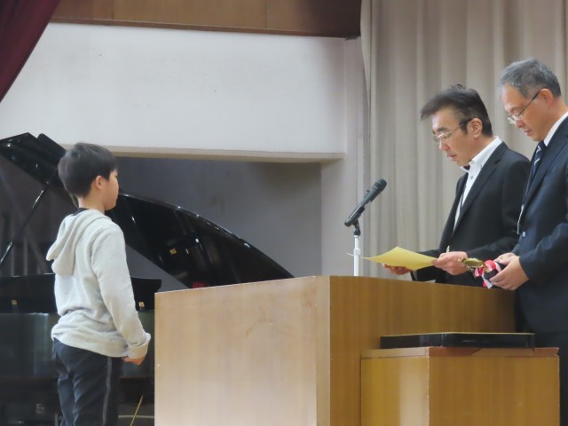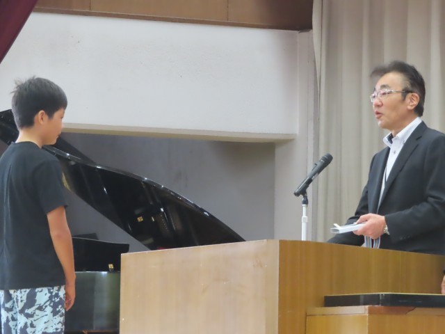 始業式の前に表彰を行いました。今日は、二人の児童を表彰しました。