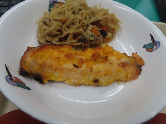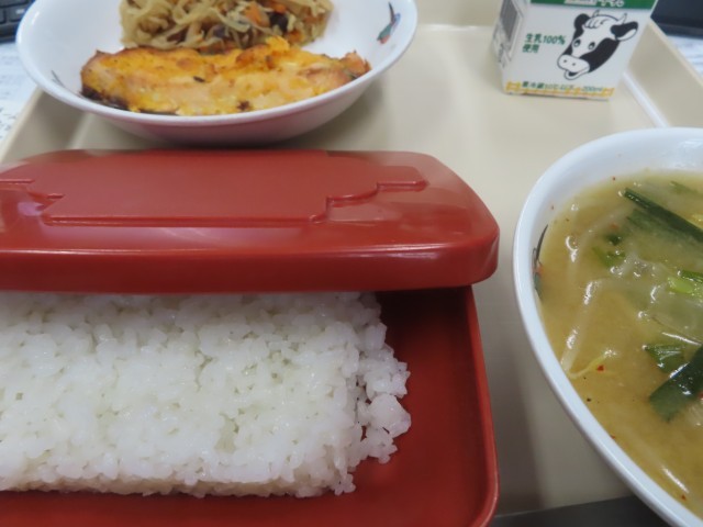 今日は『ごはん』、『鮭の紅葉焼き』、『切り干し大根の煮物』、『キムチみそ汁』。