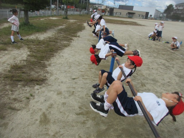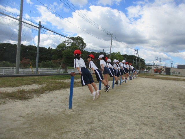 体育では、マットを使った運動遊びと合わせて、鉄棒を使った運動遊びの学習をしています。鉄棒カードにしたがっていろいろな鉄棒の種目を練習しています。子供たちは、新しい種目にも挑戦して頑張っていました。