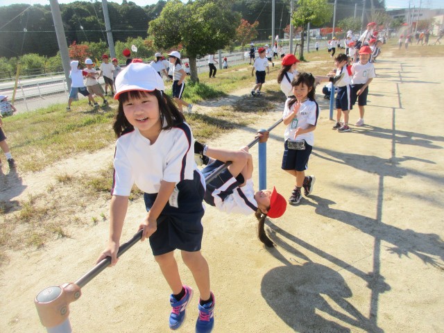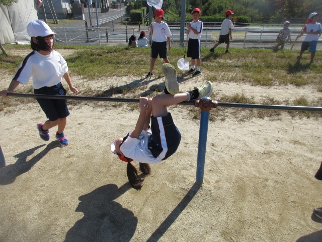 体育で、鉄棒を使った運動遊びの学習が始まり、休み時間に鉄棒練習をする人も増えてきました。「地球まわりができるようになりたいな。やり方、教えて。」…友達とお話しながら、頑張っていました。