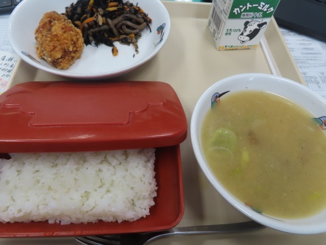 今日の給食です。今日は『ごはん』、『鮭の更紗揚げ』、『ひじきの煮物』、『なめこのみそ汁』。