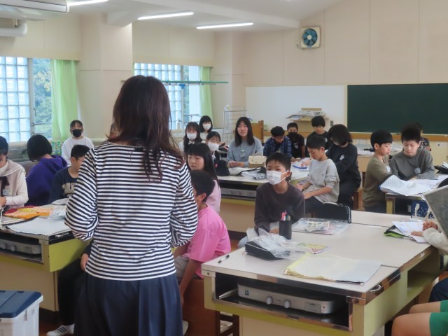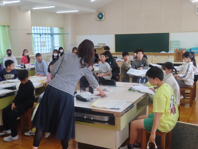 6年生の授業の様子です。家庭科で『ナップザック作り』を行っています。