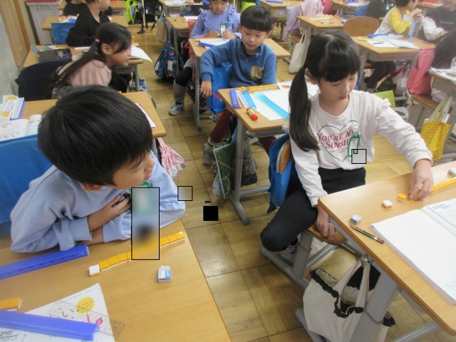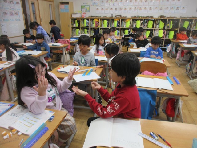 算数では、たし算の学習をしています。9+4の計算のしかたを考えて、友達に伝える学習では、ブロックを使ったり、指を使ったりして、一生懸命伝えていました。