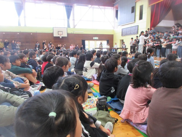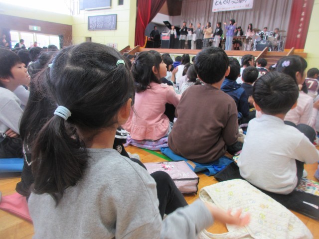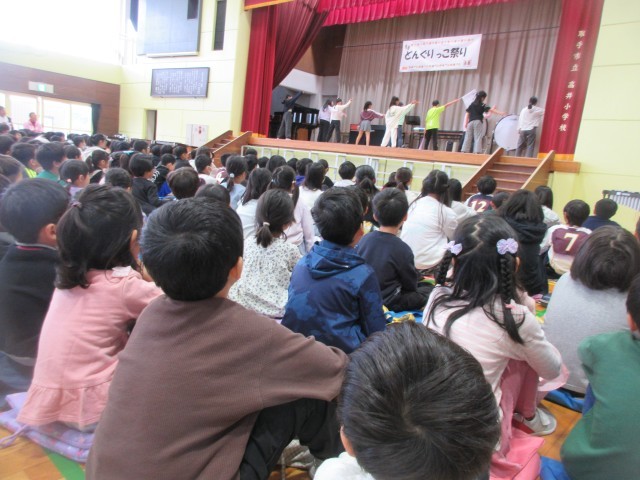 今日は、子供たちがとても楽しみにしていた「どんぐりっこ祭り」です。初めは、ステージ発表でした。ダンスクラブ、音楽クラブの発表と6年生の合唱、合奏の発表を鑑賞しました。ノリノリで手拍子を打ったり、真剣な表情で音楽に聞き入っていました。