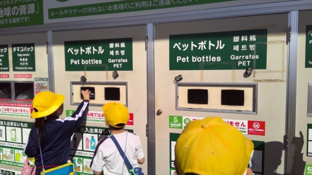 リサイクルコーナーでは、ペットボトルの分別の仕方を学び、実際に回収していただきました。