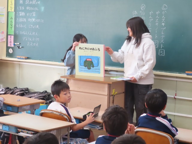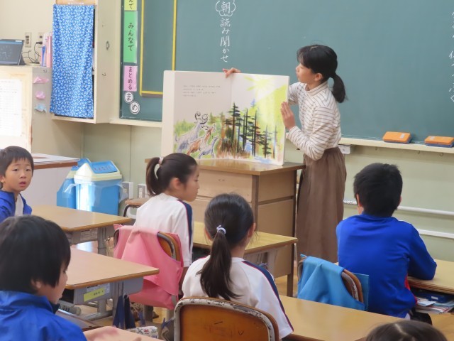 今朝の様子です。今日は、図書委員の6年生が、2年生の教室で読み聞かせを行っています。