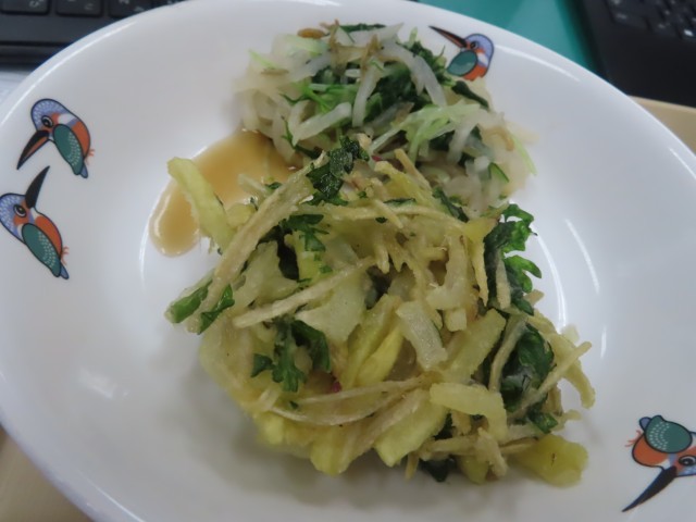 今日は『五目うどん』、『五目汁』、『かき揚げ』、『水菜と大根のじゃこサラダ』。