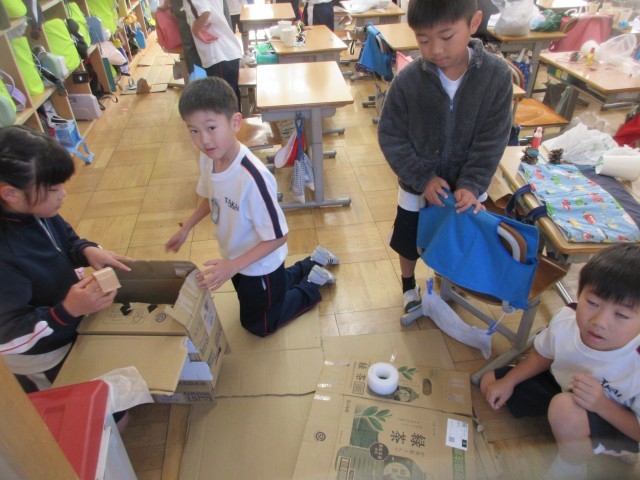 生活科では、「あきのおもちゃまつり」で遊んでもらうためのおもちゃ作りを進めています。おもちゃだけではなく、景品作りも合わせて行っています。「こうするともっとおもしろくなりそうだよ。」…それぞれに工夫をしながら取り組んでいました。