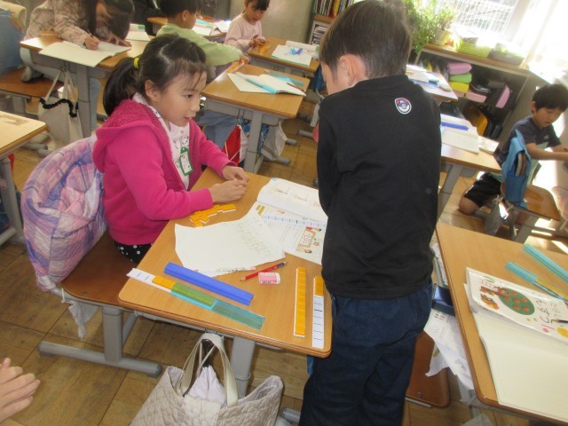 算数では、引き算の学習に入りました。今週は、13ー9の計算の仕方を考えました。ブロックを操作しながら、どう考えるとよいかペアで自分の考えを伝え合いました。「ブロックを白と黄色に分けるとわかりやすいね。」「僕の考え方と同じだ。」…自分の考えを伝えることにも、友達の意見を聞くことにもだんだん慣れてきたようです。