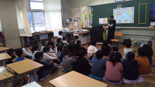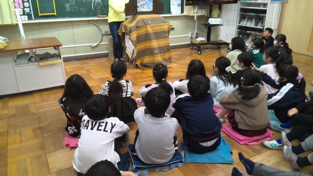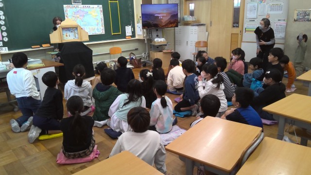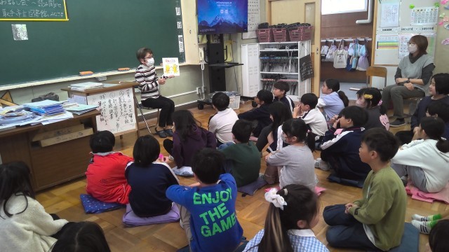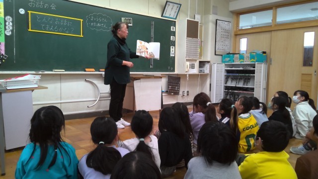 学校訪問おはなし会が行われました。絵本の読み聞かせや紙芝居、わらべうたを楽しみました。