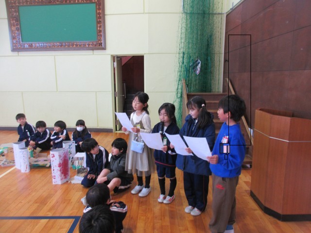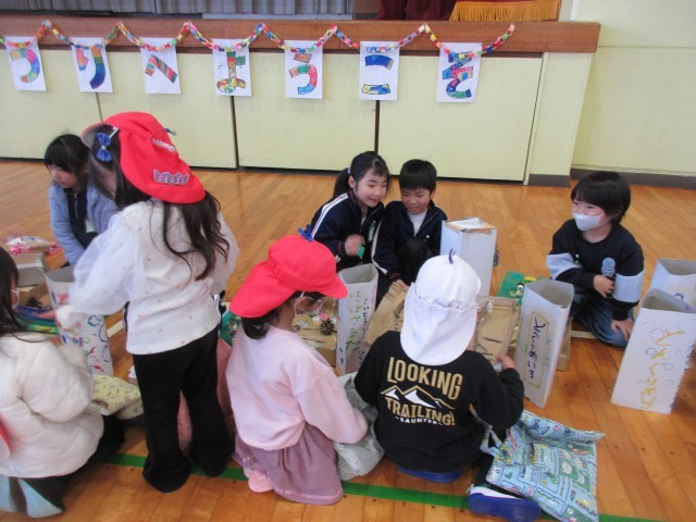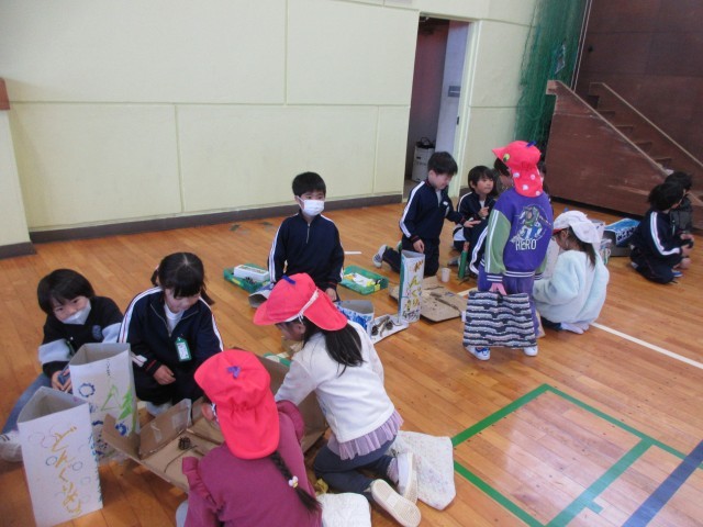 今日は、子供たちが楽しみにしていた「秋のおもちゃまつり」が行われました。あづま幼稚園と永山保育所の年長さんをお招きして、手作りの秋のおもちゃで遊んでもらいました。1年生の子供たちは、年長さんに積極的に声をかけて、遊んでもらっていました。