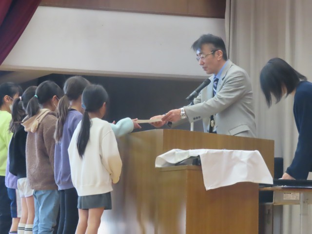 サッカーで全国大会に出場する6年生男子児童への表彰と、先日の持久走大会の表彰でした。