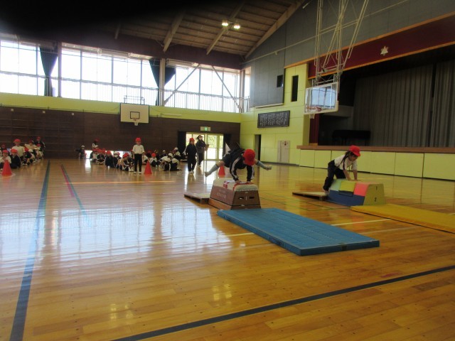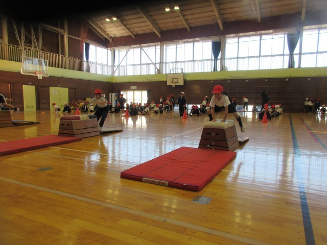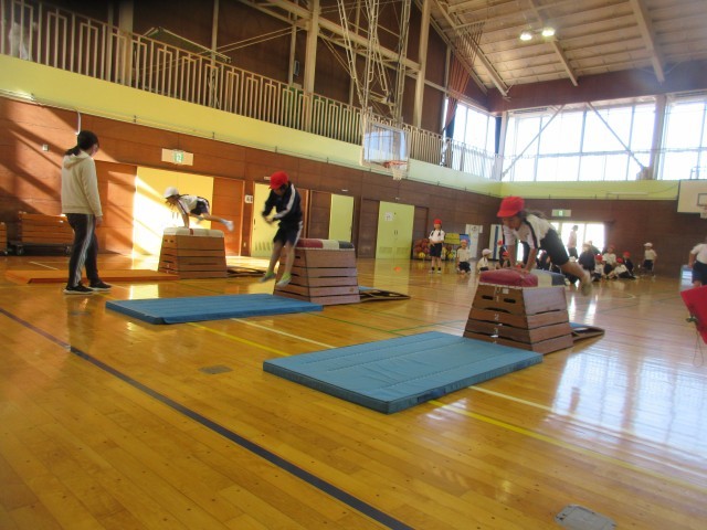 体育では、とび箱の学習に入りました。それぞれに目標とする段数を決め、アドバイスをもらいながら練習を頑張っています。「踏み切り板の奥の方で、しっかりジャンプの音を聞かせるんだね。」「手はパーに開いて、前の方につくんだね。」…アドバイスを確かめながら、一生懸命練習していました。