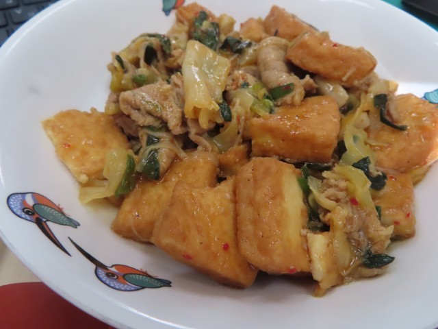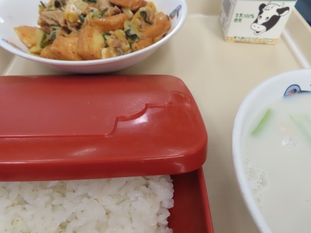 今日の給食です。今日は『麦ごはん』、『生揚げのキムチ炒め』、『根菜の豆乳スープ』。