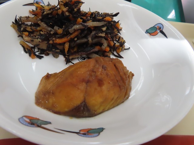今日の給食です。今日は『ごはん』、『鯖のカレー煮』、『ひじきのそぼろ炒め』、『かにかま汁』。