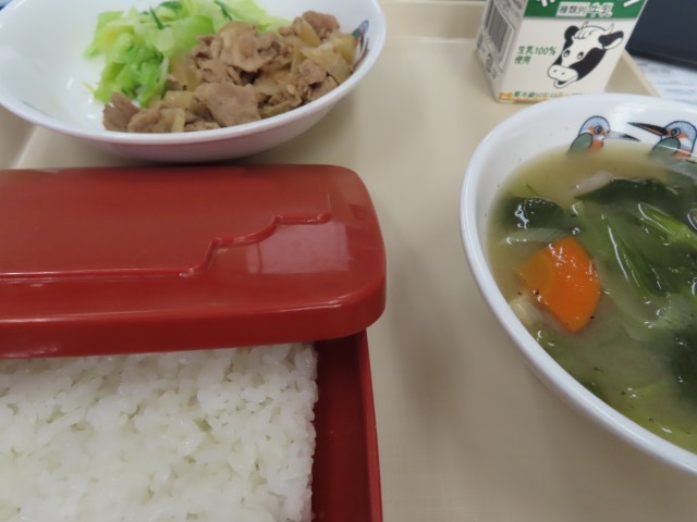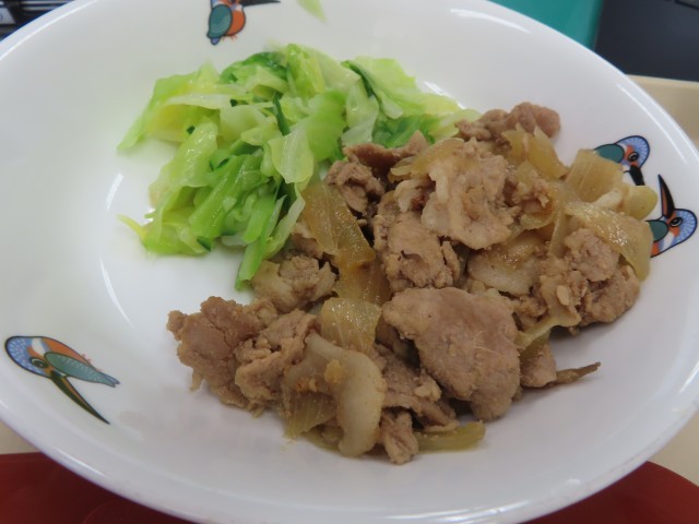 今日は『ごはん』、『豚肉のしょうが炒め』、『旨塩キャベツ』、『みそ汁』。
