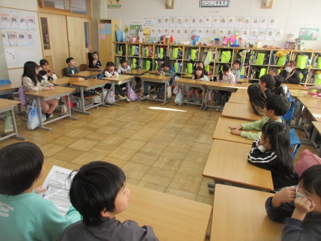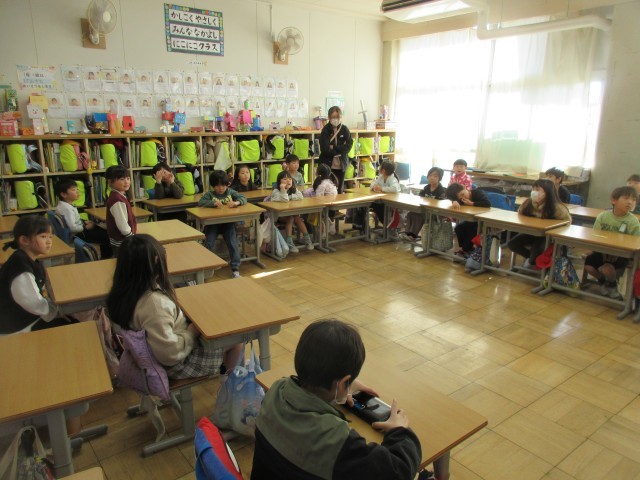 学級活動の時間には、話し合い活動に挑戦しました。議題は、「クラスのやさしさいっぱい宣言を考えよう。」です。司会や黒板書記など役割を決めて話し合いをしました。1月に予定されている「やさしさいっぱい集会」に向けて、やさしさあふれる学校を自分たちでつくっていくために、クラスではどんなことをがんばっていくとよいか意見を出していきました。初めての話し合い活動でしたが、人の意見をしっかり聞いて、自分の考えもきちんと伝えていました。