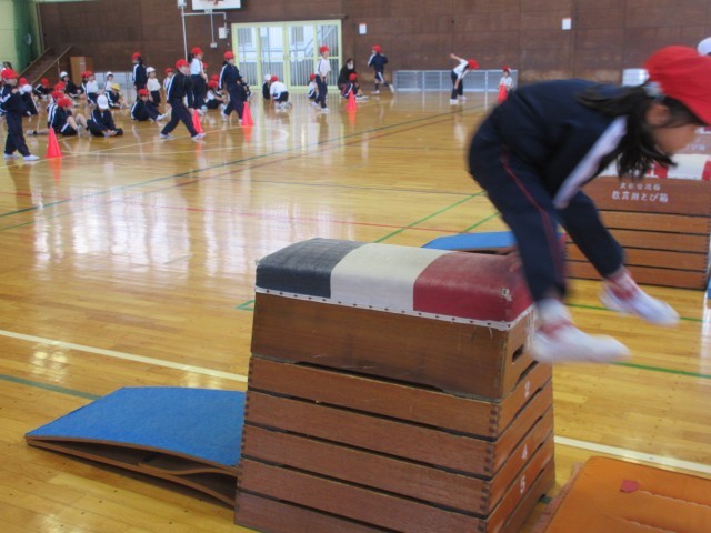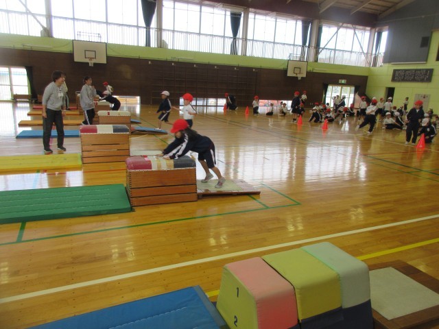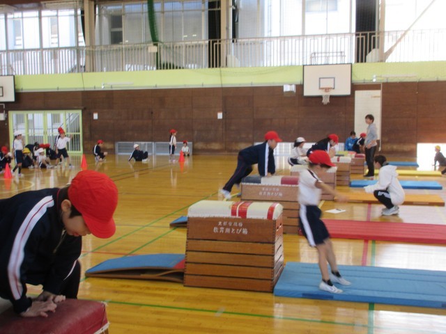 体育では、とび箱の学習をしました。上手に跳べる人の模範演技を見ながら、とび方のコツをつかみ、練習に生かしていました。「ぴょーんというジャンプの線を意識して踏み切り板の前の方で、ジャンプするんだね。」「今、お尻がとび箱にあたっちゃったから、次はもっと前に手をついてみよう。」…たくさんとぶうちに、上手にとべるようになってきました。