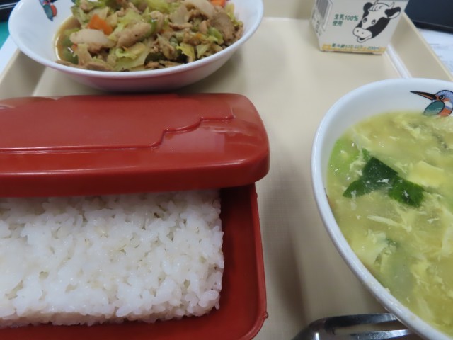 今日の献立は『麦ごはん』、『回鍋肉』、卵とコーンの中華スープ。