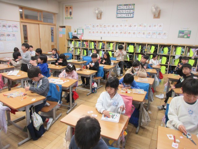 外国語活動の時間には、みんなでクリスマスツリー作りをしました。大きなクリスマスツリーに、一人一人が色を付けたカードのオーナメントを貼って飾っていきました。「reindeer(トナカイ)」や「ornament(オーナメント)」など、クリスマスに関係のある単語をALTに英語で伝えてカードをもらっていました。大きなクリスマスツリーが完成すると、子供たちも満足そうでした。