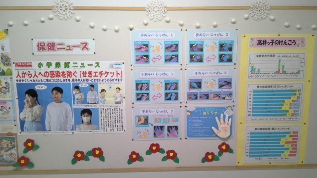 上手な手洗いで感染症を予防しよう 公開日 2026/01/09 更新日 2026/01/09 保健室からのお知らせ 保健室前の廊下に感染症予防に関する掲示をしています。11月と12月は保健委員会の5、6年生が手洗い実験を行いました。汚れがどのくらい落ちているのかを水洗いと石けん洗いで比較したり、石けんの量や洗う時間で比較したりしました。洗い残しのないよう丁寧に手を洗い、感染症を予防しましょう。