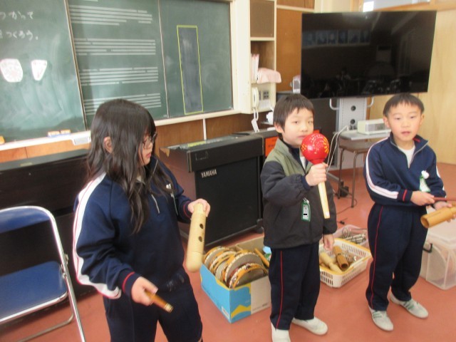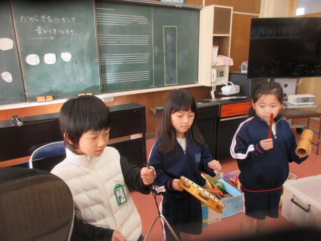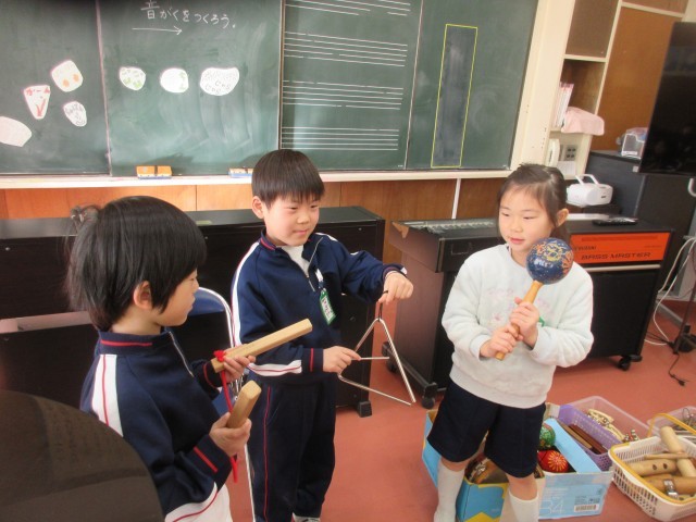 音楽では、「がっきとなかよくなろう」の学習で、絵や擬音語から想像する楽器の音を探し、つなげて音楽をつくりました。「『じゃらじゃら』の音は、マラカスの音がぴったりかなあ。」「トライアングルの鳴らし方を1回目と2回目で変えてみようかな。」…グループで協力して、楽しそうに活動していました。