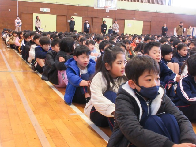 1/8(木)には、朝の時間に、全校集会が行われました。新年明けて、初めての全校集会でした。1年生の子供たちは、しっかりとした態度で集会に臨んでいました。学校長の話を聞く真剣な表情からも、新しい年に向かう意気込みが感じられました。