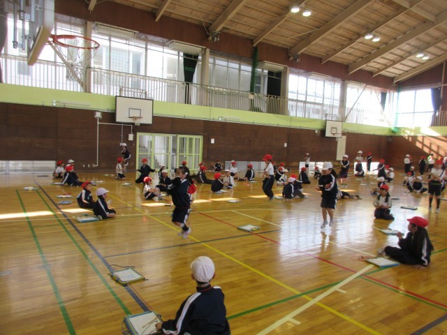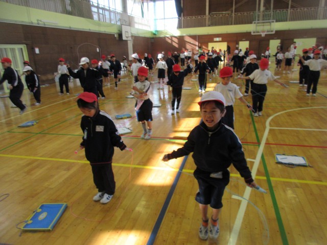 体育では、なわとびの学習を続けています。なわとびカードにしたがって練習を進めました。二重とびが得意な人には、模範演技を披露してもらいました。子供たちは、上手にとべるコツを見つけながら模範演技を見ていました。