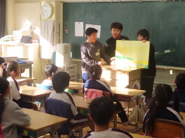 今日は、1年生の児童対象に5年生の図書委員会の児童が『読み聞かせ』を行ってくれました。素晴らしかったです。