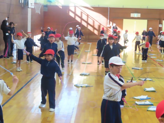 1年生の様子です。寒い中での体育。『短縄跳び』。