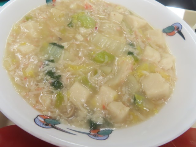 今日の給食です。今日の献立は『麦ごはん』、『かにかまと豆腐のうま煮』、『肉団子スープ』。