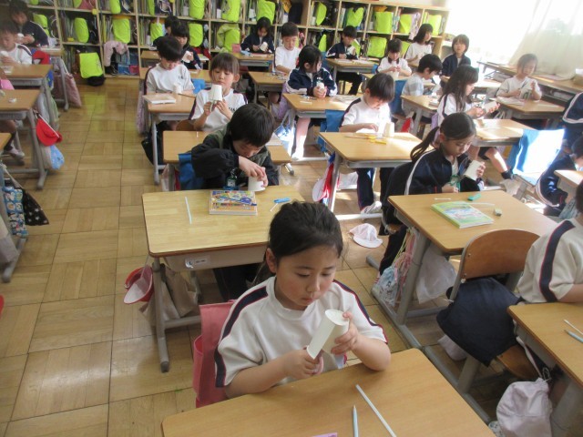 生活科の時間には、「かぜであそぼう」の学習で、かざわとかざぐるまを作って遊びました。「すごいすごい!かざぐるま、ぐるんぐるんまわるよ。」「かざわは、風と同じ向きに置いたら、どんどんまわって楽しかったよ。」…風を生かして繰り返し遊んでいました。